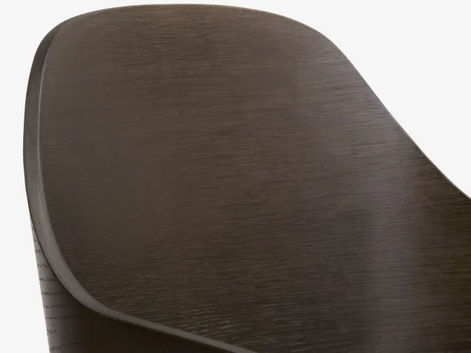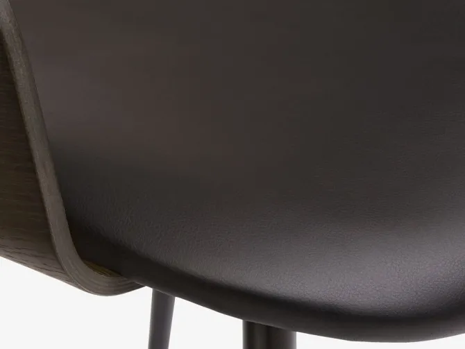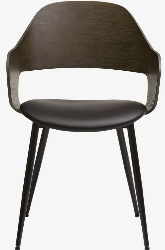 Spisebordsstol med armlæn, der giver ekstra støtte og komfort. Stolen har et polstret sæde i sort kunstlæder og et buet ryglæn i mørk egefiner. Træet er lakeret for at forlænge holdbarheden. Sorte ben i stål.