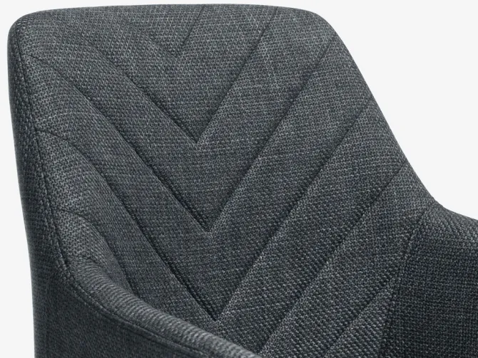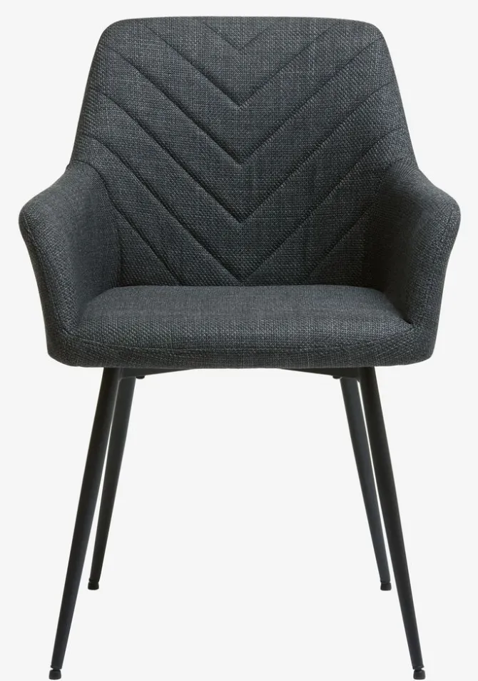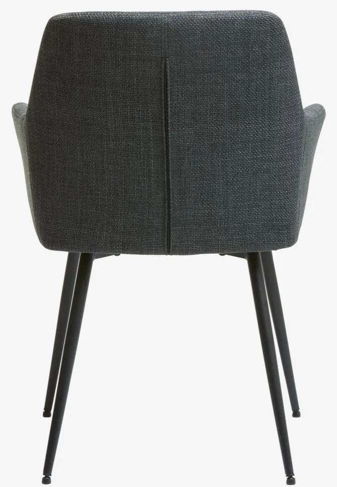 Spisebordsstol med armlæn, der giver ekstra støtte og komfort. Stolen har et polstret sæde og ryglæn i mørkegråt stof. Sorte ben i stål.