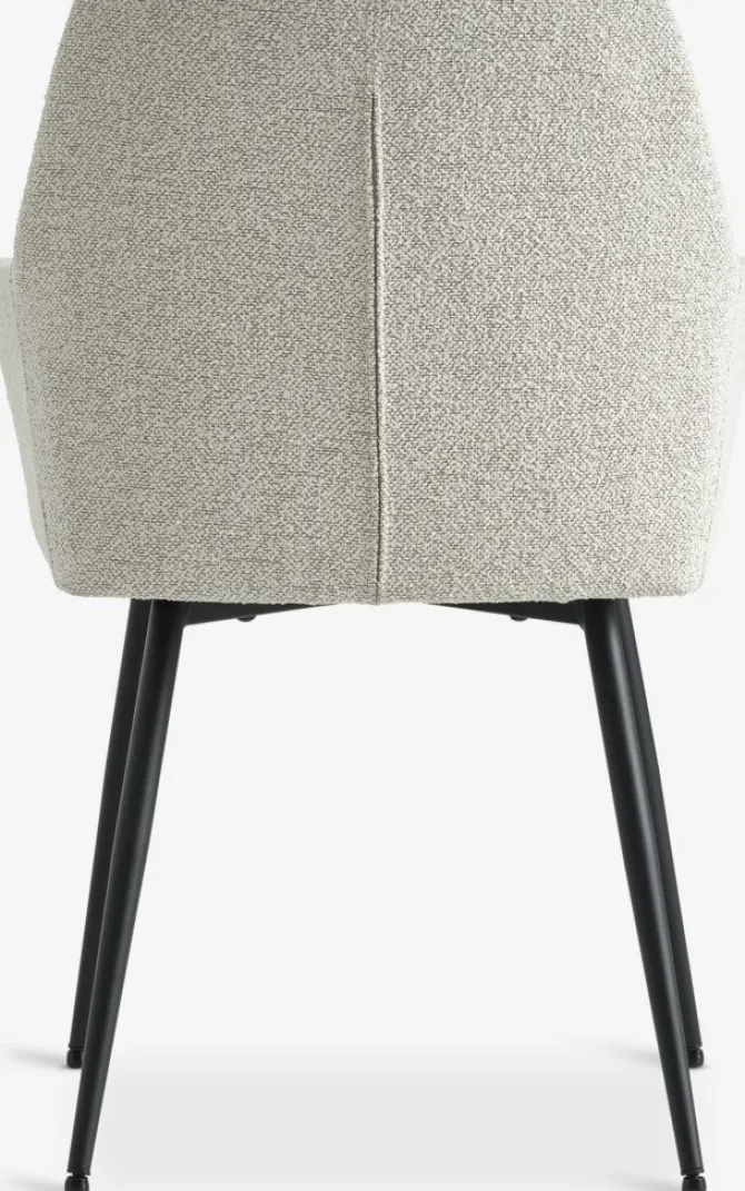 Spisebordsstol med armlæn, der giver ekstra støtte og komfort. Stolen har et polstret sæde og ryglæn i råhvidt stof. Sorte ben i stål.