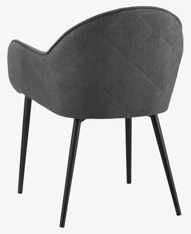 Spisebordsstol med armlæn, der giver ekstra støtte og komfort. Stolen har et polstret sæde og ryglæn i gråt stof. Sorte ben i stål.