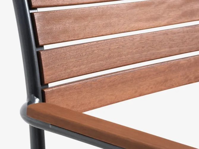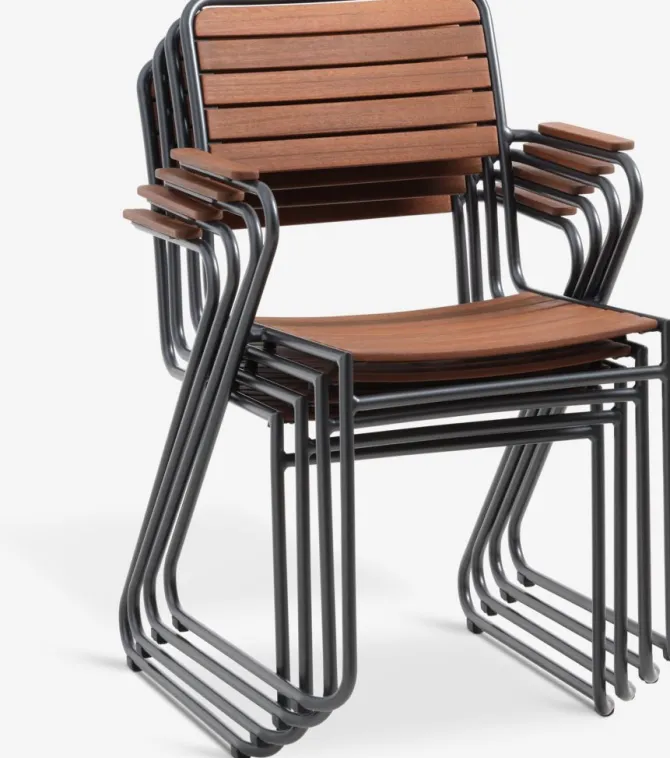 Stabelstol med sæde og ryglæn i olieret FSC-hårdttræ® og sort stel i pulverlakeret aluminium. Det slidstærke træ er behandlet med olie for at beskytte det og fremhæve dets naturlige farve. Regelmæssig oliering af træet anbefales for at bevare dets farve og beskytte det mod fugt. Aluminium er et let og robust materiale, der ikke ruster. Havestolen kan stables for kompakt opbevaring.