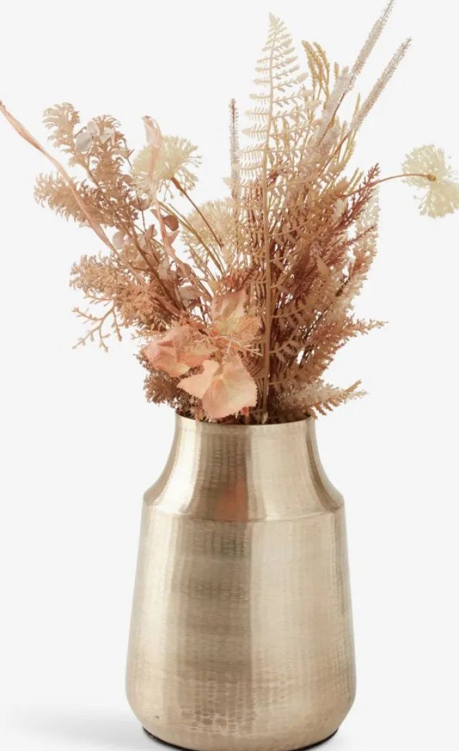 Messingfarvet vase i aluminium med et elegant og moderne design. Vasen har en glat overflade med en skinnende finish, hvilket giver den et stilfuldt udtryk. Den er ideel til at fremvise blomster eller som et dekorativt element i hjemmet. Ø22 x H30 cm