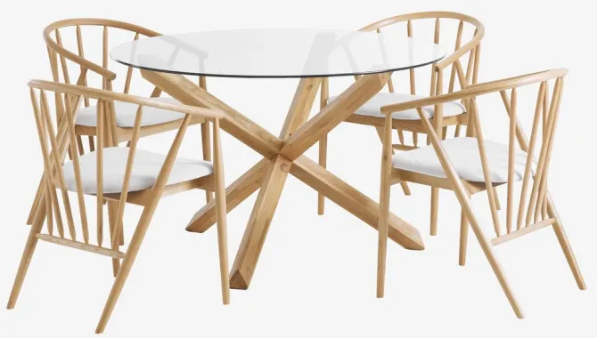 Bord: Massiv eg og hærdet glas. Ø119 x H75 cm. Stol: Stof og massiv eg.