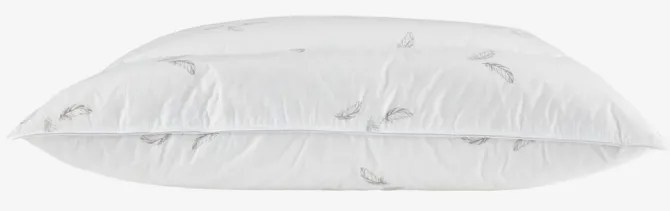 Andedunspude 60×63/70 cm med 4 kamre. Fyld af 50% hvide andedun/50% andefjer i yderkamrene og 85% hvide andefjer/15% andedun i inderkamrene, 820 g. Bolster i 100% bomuldscambric. Bæreevne 350/300. Vask 60°C.