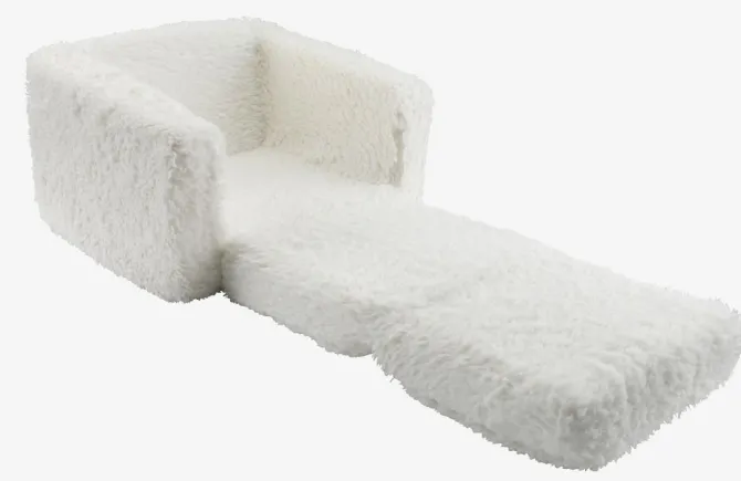 Vaskbart teddystof. Sæde- og ryghynder i skum. Sædet kan foldes ud, så den kan bruges som madras. B49 x H40 x D43 cm