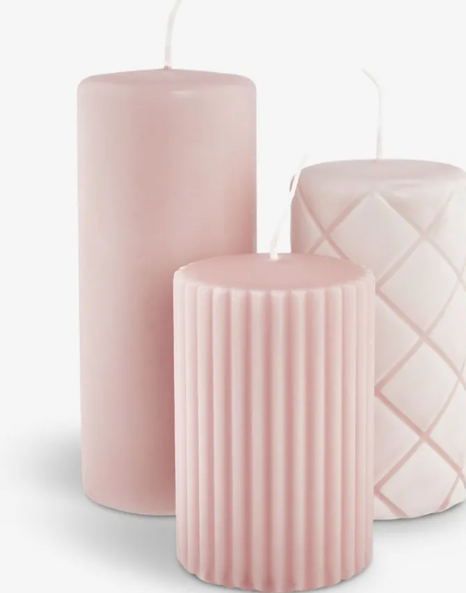 Sæt med tre rosa bloklys, hver med unikke design. Et glat rosa lys, et lys med rillet overflade, og et med et elegant diamantmønster. Perfekte til at skabe en hyggelig atmosfære i dit hjem. Lysene har en brændetid på henholdsvis 25, 32 og 42 timer. Ø6 x H9/11/14 cm