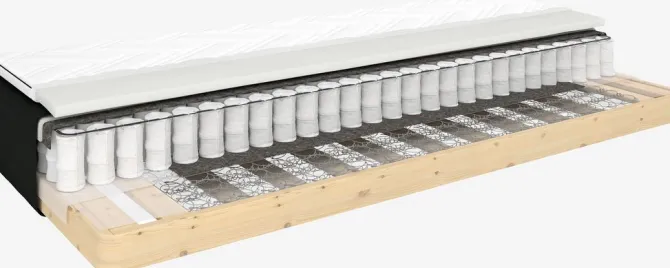 Dobbeltfjedret boxmadras 90×200 cm med 5 komfortzoner, hvilket giver en præcis og optimal støtte. Øverst pocket-fjedre 250/m² polstret med purskum. Nederst minibonell-fjedre 150/m². Inkl. 5 cm tyk topmadras med kerne af koldskum. Vaskbart strækbetræk med blød, kraftig quiltning. Ekskl. ben.