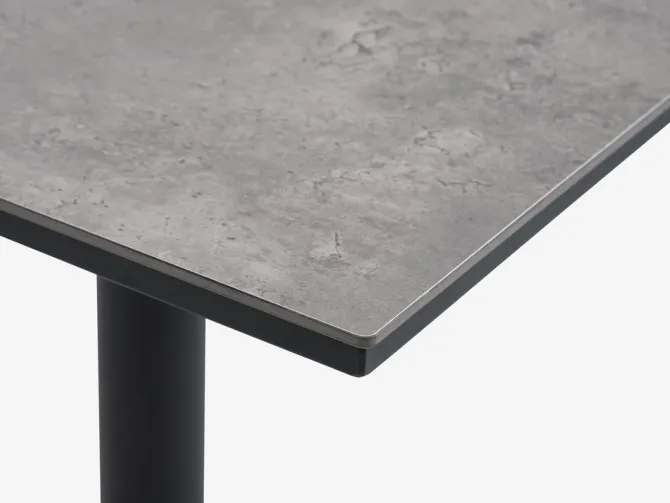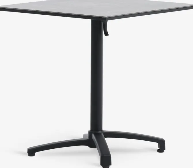 Cafébord med grå bordplade i højtrykslaminat og sort stel i pulverlakeret aluminium. Bordpladen kan vippes helt for kompakt opbevaring. Aluminium er et let og robust materiale, der ikke ruster. B70 x L70 x H73 cm