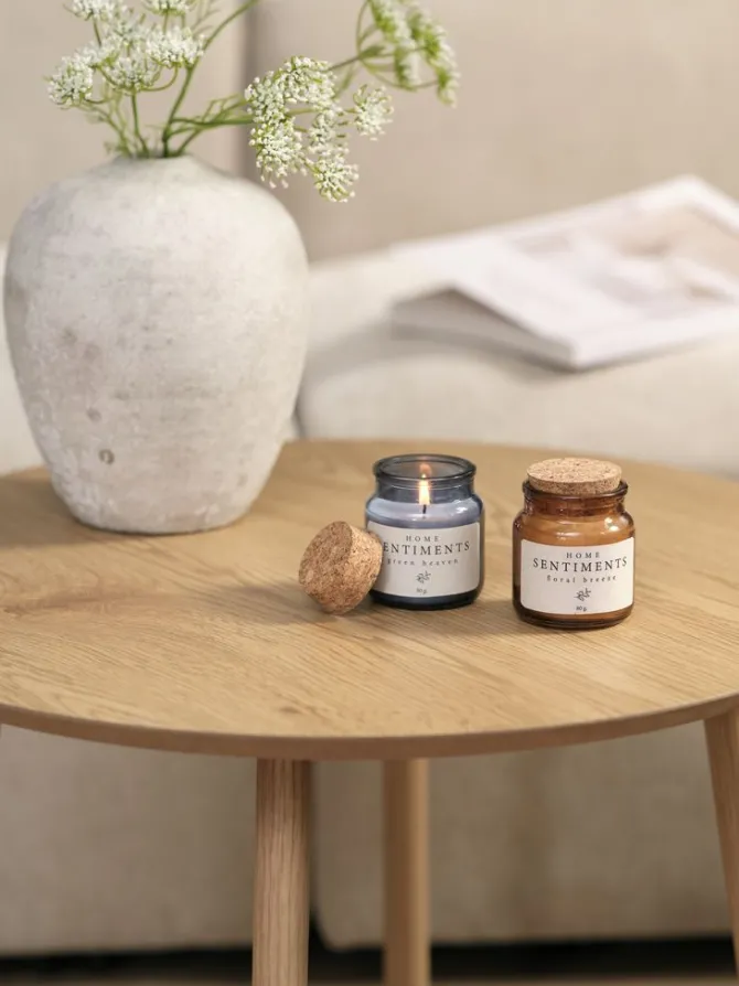 Duftlys i elegant glaskrukke med kork låg. Hvert lys giver en behagelig duft og har en brændetid på 20-24 timer. Ideel til at skabe en hyggelig atmosfære i ethvert rum. Fås i støvet blå og latte. Ø6 x H8 cm