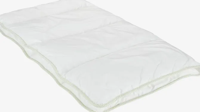 Allergivenlig babydyne 67×100 cm med luftigt, isolerende fyld af silikoniserede, spiralformede hulfibre, 80 g. Blødt bolster i 100% bomuldscambric. Det tætvævede bolster begrænser støvmider i at trænge igennem. Vask 60°C. Inkl. opbevaringstaske.