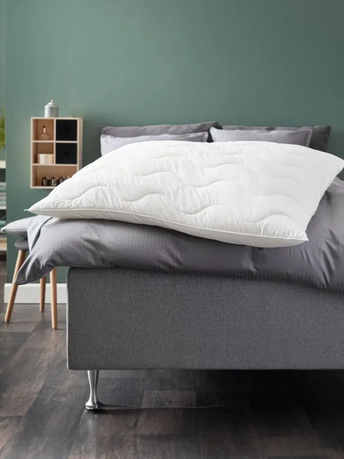 Fiberpude 70×100 cm med let, luftigt fyld af silikoniserede, spiralformede hulfibre, 1500 g. Bolster i 65% polyester/35% bomuld. Quiltet med hulfibre. Vask 60°C.