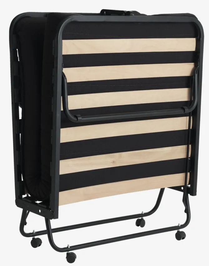 Stål. 11 cm tyk madras med kerne af trykaflastende memory foam og purskum. Med trælameller. Kan klappes sammen. B90 x L200 x H38 cm