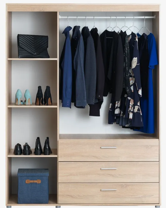 Kunstfiner. Skuffer med fuldt udtræk. Skabets indretning: 4 hylder og 1 bøjlestang. B150 x H198 x D60 cm