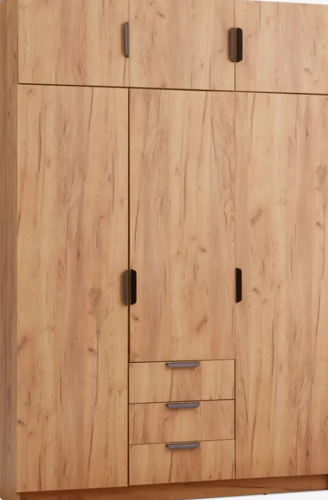 Kunstfiner. Skabets indretning: 4 hylder og 2 bøjlestænger. B144 x H176 x D50 cm