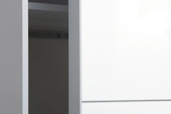 Kunstfiner. Med skydedøre. Skabets indretning: 2 hylder og 2 bøjlestænger. B151 x H201 x D66 cm