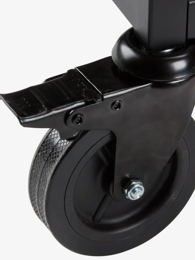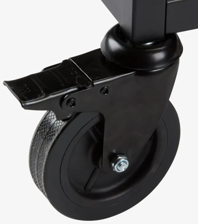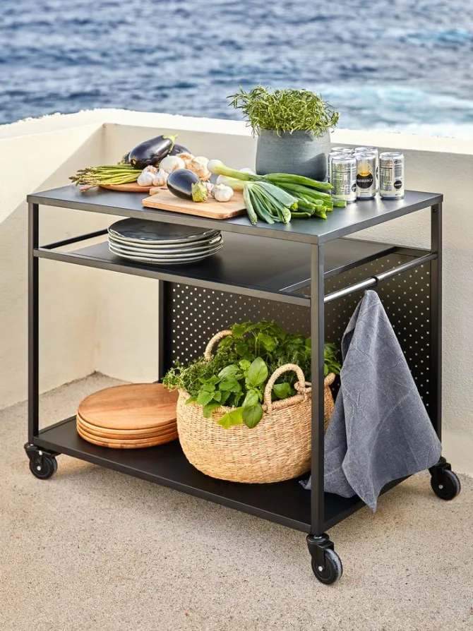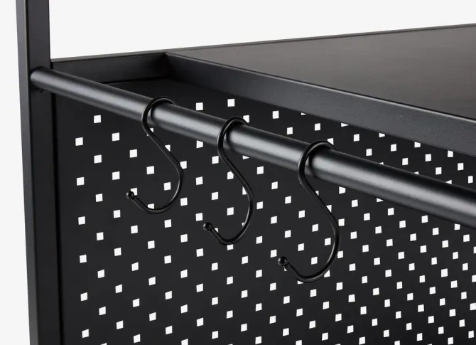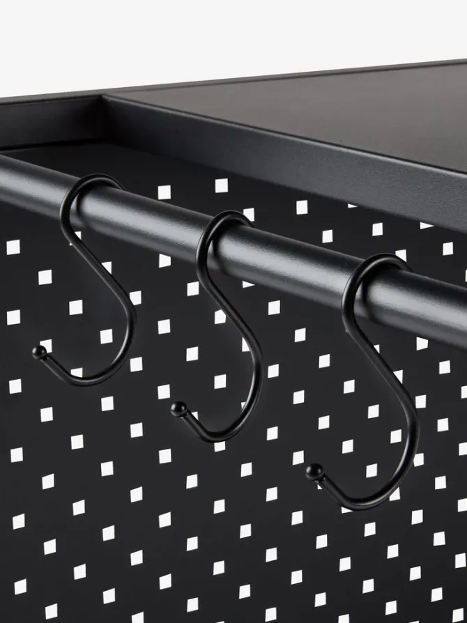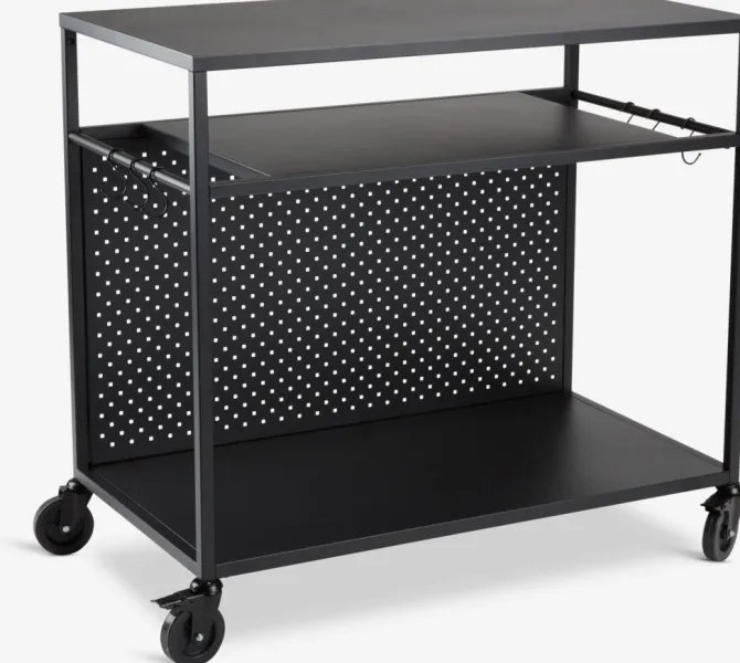 Sort grillbord med pulverlakeret stålramme og bordplade. Det kan bruges som base for en bordgasgrill og er ideel til at organisere redskaber og forsyninger, når man laver mad udendørs. De 2 hjul gør det nemt at flytte bordet rundt. Incl. 6 kroge. B50 x L90 x H84 cm