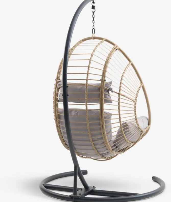 Stål og polyrattan. Inkl. stand og luksushynder med slidstærkt, strukturvævet betræk. B118 x H184 x D106 cm