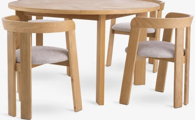 Bord: Massiv eg og egefiner. Ø129 x H75 cm. Stol: Stof og massiv eg.