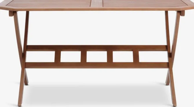 Havebord med bordplade i olieret FSC® hårdttræ. De let buede, krydsede ben og små detaljer i designet giver bordet et unikt og charmerende udtryk. Det slidstærke træ er behandlet med olie for at beskytte det og fremhæve dets naturlige farve. Regelmæssig oliering af træet anbefales for at bevare dets farve og beskytte det mod fugt. B86 x L150 x H75 cm