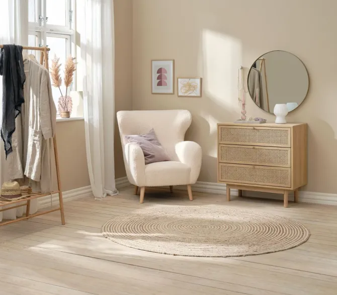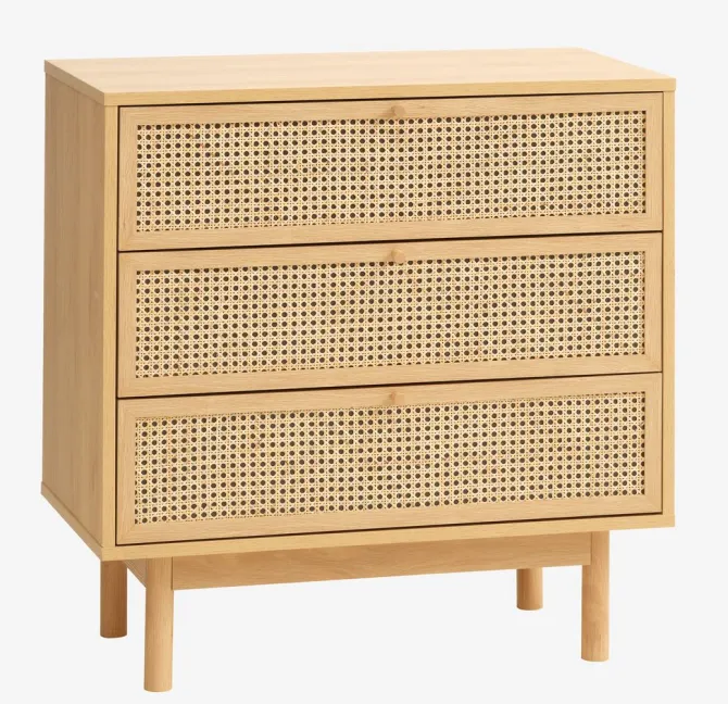 Massivt træ, rattan og kunstfiner. Skuffer med soft-close og fuldt udtræk. B85 x H85 x D45 cm