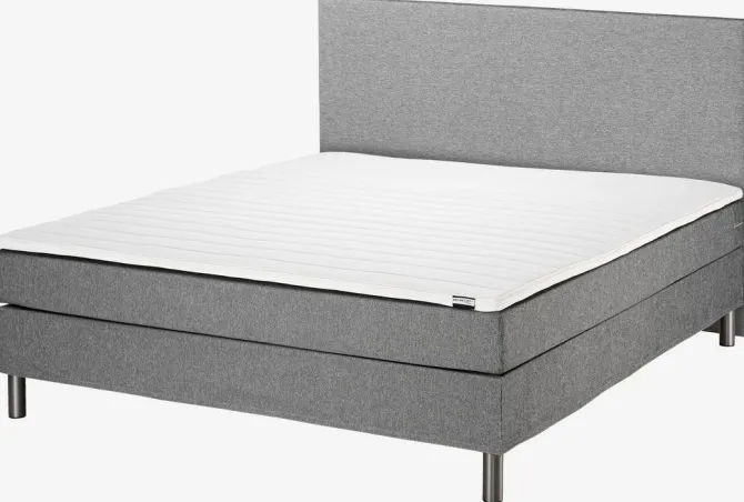 Kontinentalseng 180×200 cm. 1 vendbar springmadras med bonell-fjedre 110/m², polstret med purskum. 1 topmadras, 4 cm tyk med kerne af purskum. Vaskbart strækbetræk med kraftig quiltning. Basen består af 1 ramme. Inkl. ben. Ekskl. gavl.