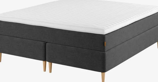 Kontinentalseng 180×200. 1 vendbar springmadras med pocket-fjedre 260/m2, polstret med purskum. Madrassen er inddelt i 7 komfortzoner, hvilket giver en unik, ergonomisk korrekt støtte. 1 topmadras, 7 cm tyk med kerne af purskum. Vaskbart betræk med blød, kraftig quiltning. Basen består af 2 boxmadrasser med pocket-fjedre 205/m2, inddelt i 7 komfortzoner. Inkl. ben. Ekskl. gavl.