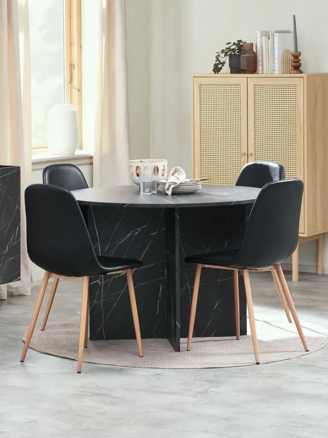 Bord: Kunstfiner. Ø110 x H75 cm. Stol: Kunstlæder og stål.