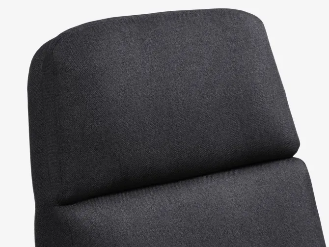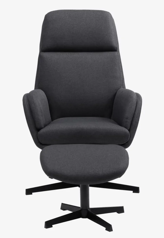 Stof. Sæde- og ryghynder i skum. Med drejefod i stål og trinløs vippefunktion. Inkl. fodskammel. B70 x H107 x D119 cm