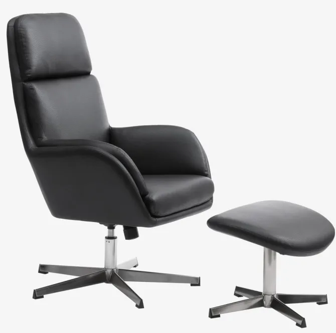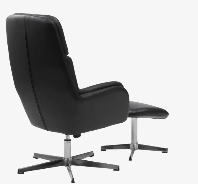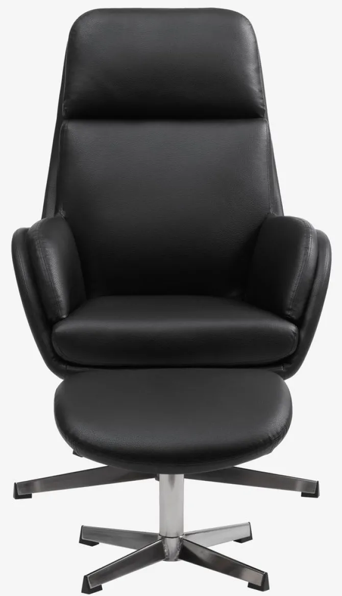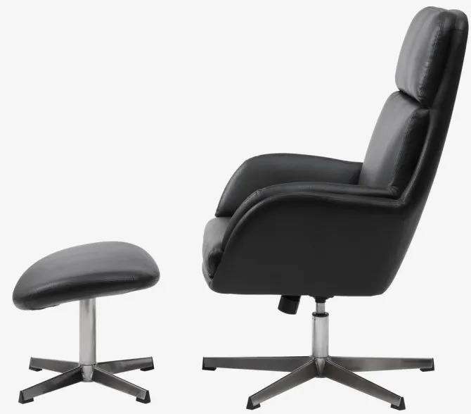 Kunstlæder. Sæde- og ryghynder i skum. Med drejefod i krom og trinløs vippefunktion. Inkl. fodskammel. B70 x H107 x D119 cm