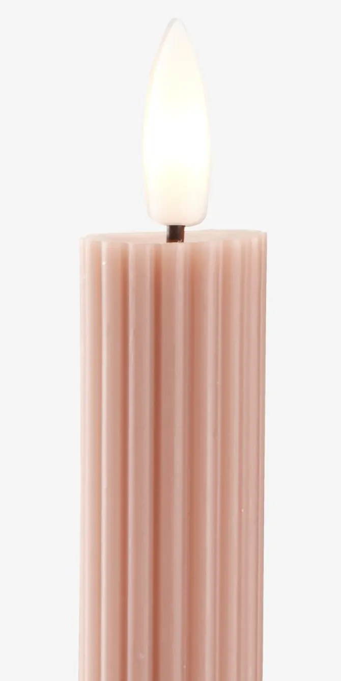 Støvet rosa LED-lys med rillet design. Disse lys har en indbygget timerfunktion med 6/18 timers interval og en lystid på 30.000 timer. Bruger 2 AAA batterier (medfølger ikke). Ideelle til indendørs brug. Ø2.2 x H24.5 cm