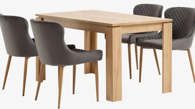 LINTRUP L140 bord eg + 4 PEBRINGE stole grå velour