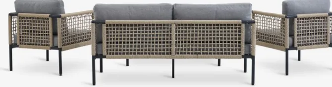 BAMLE loungesæt består af en loungesofa med plads til 2,5 personer, 2 loungestole og et loungebord. De matchende loungemøbler kan komfortabelt rumme 4 til 5 personer.