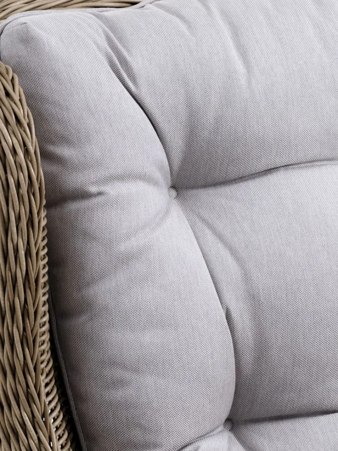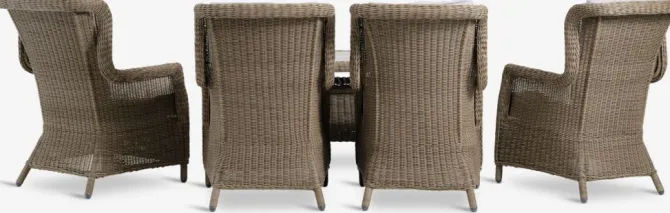 4-personers loungesæt. Bord: Aluminium, DURAWOOD® komposittræ og polyrattan. DURAWOOD® er et slidstærkt sammensat materiale, bestående af FSC®-hårdttræsfibre og plast. B84 x L127 x H65 cm. Stol: Aluminium og polyrattan. Inkl. luksushynder med slidstærkt, strukturvævet betræk.
