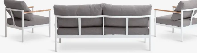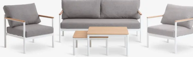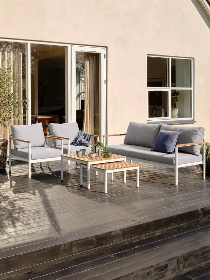 4.5-personers loungesæt. Bord: Aluminium og olieret FSC®-hårdttræ. B72/62 x L72/62 x H39/32 cm. 2.5-personers sofa og stol: Aluminium og olieret FSC®-hårdttræ. Inkl. luksushynder med slidstærkt, strukturvævet betræk.