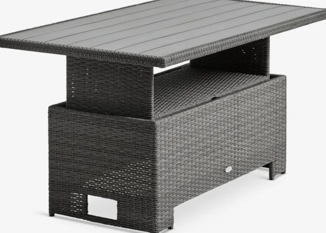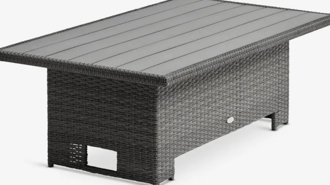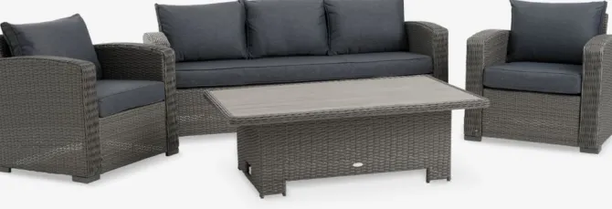 5-personers loungesæt. Bord: Aluminium, kunsttræ og polyrattan. Højdejusterbart. B85 x L134 x H45/68 cm. 3-personers sofa og stol: Aluminium og polyrattan. Inkl. luksushynder med slidstærkt, strukturvævet betræk.