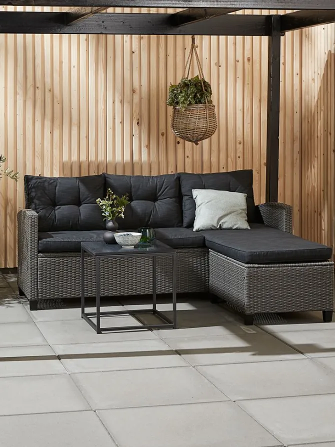 3-personers loungesofa med chaiselong i stål og polyrattan. Kan spejlvendes. Inkl. luksushynder med slidstærkt, strukturvævet betræk. B170 x H76 x D67/142 cm
