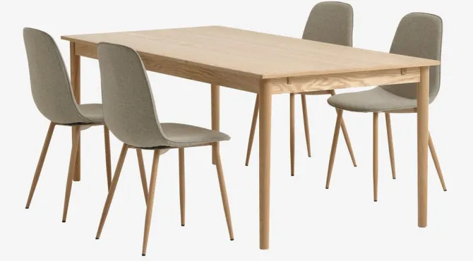 Bord: Massiv eg og egefiner. Inkl. 2 tillægsplader. B95 x L190/235/280 x H75 cm. Stol: Stof og stål.