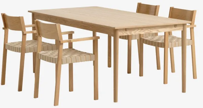 Bord: Massiv eg og egefiner. Inkl. 2 tillægsplader. B95 x L190/235/280 x H75 cm. Stol: Polyester, egefiner og massiv eg.