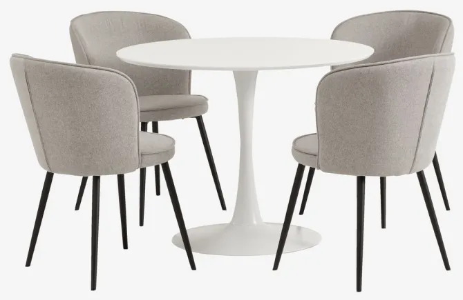 RINGSTED Ø100 bord hvid + 4 RISSKOV stole lysegrå