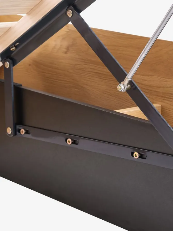 Kunstfiner. Med opbevaringsplads og sengebund med hydraulisk lift. Passer til spring- og skummadrasser 140×200 cm. Inkl. lamelbund. Ekskl. madrasser. B144 x L204 x H35 cm