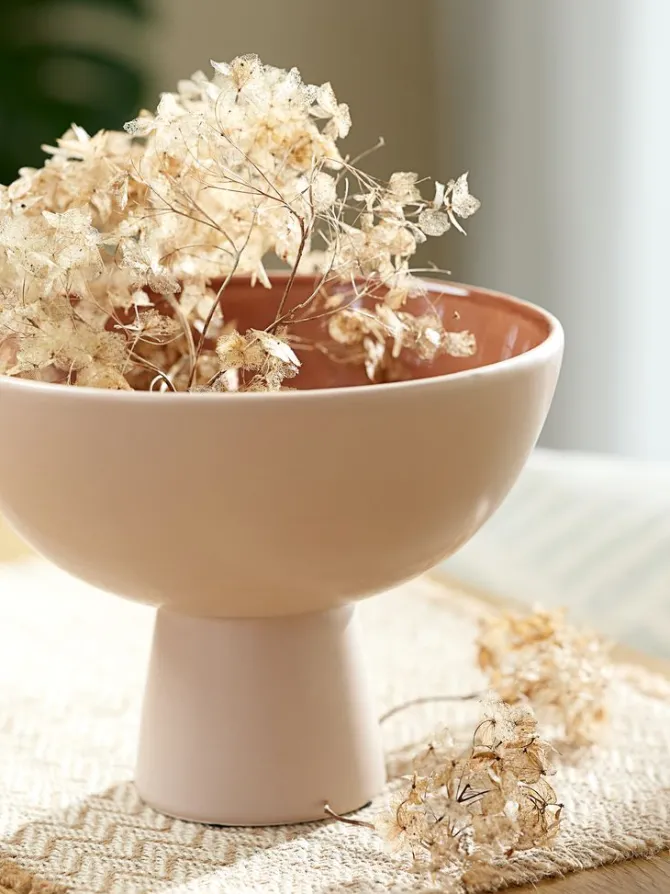 Dekorativ skål i dolomit med en elegant kombination af beige og terrakotta farver. Skålen har en stilfuld fod, der giver den et moderne og sofistikeret udseende. Perfekt til at fremvise frugt eller andre dekorative genstande i hjemmet. Ø21 x H16 cm