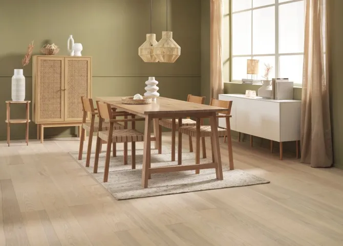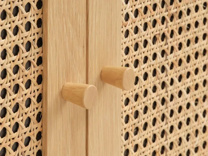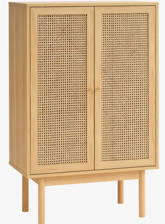 Massivt træ, rattan and kunstfiner. Låger med soft-close. B85 x H134 x D45 cm