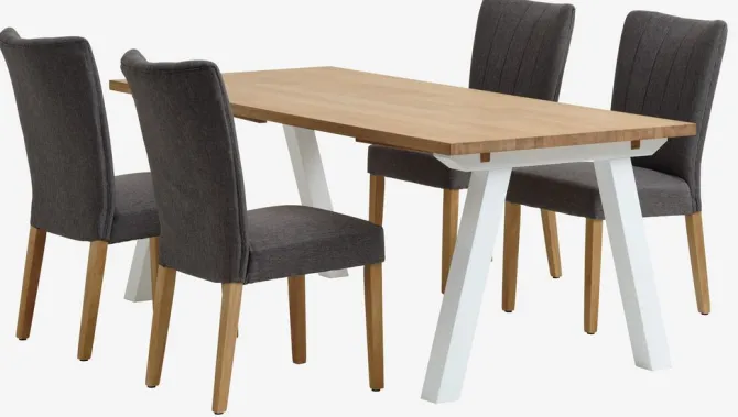 Bord: Massiv eg, egefiner og MDF. Ekskl. tillægsplader. B90 x L200 x H75 cm. Stol: Stof og massivt træ.
