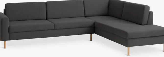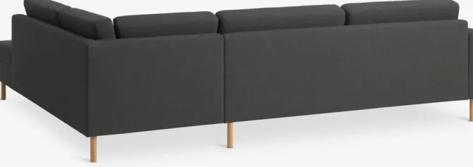 4-personers hjørnesofa i stof. Sæde- og ryghynder i skum. Ben i massiv bøg. Kan ikke spejlvendes. B280 x H81 x D87/226 cm