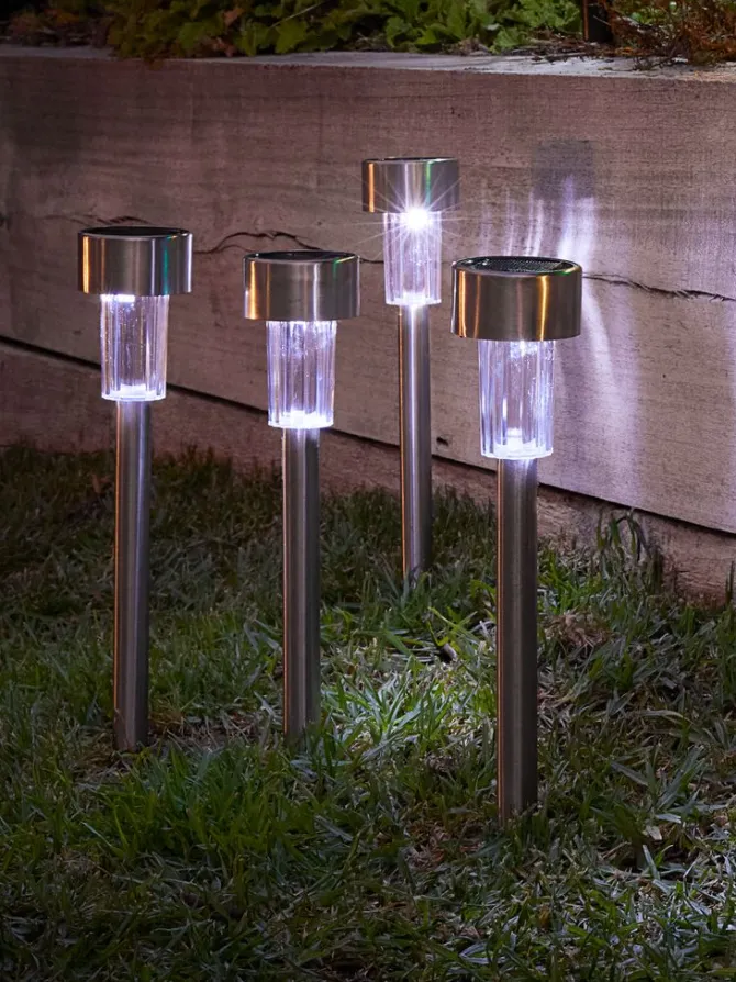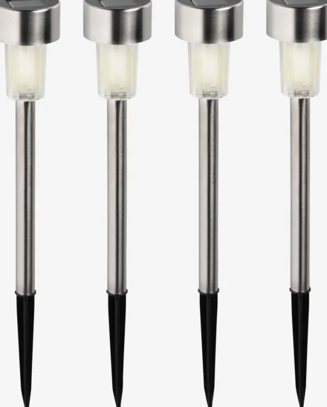 Sæt med 4 solcellelamper i stål med indbygget LED-lys. Disse lamper oplyser dine havegange i 6-8 timer og skaber en indbydende udendørs atmosfære. Hver lampe har et spyd, der nemt kan placeres i jorden. Ø6 x H37 cm