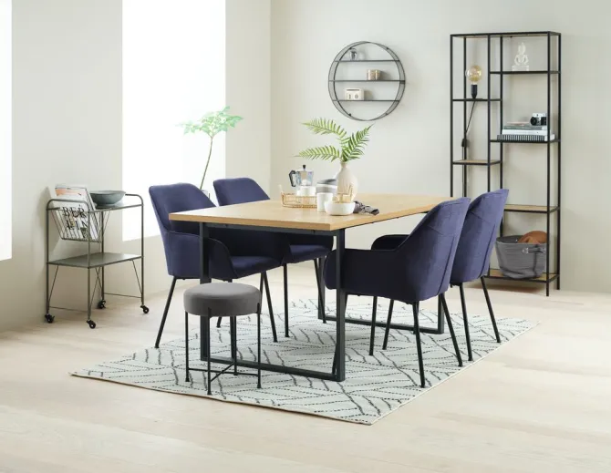 Spisebord med bordplade i kunstfiner med egetræslook og sorte ben i stål. B90 x L160 x H75 cm
