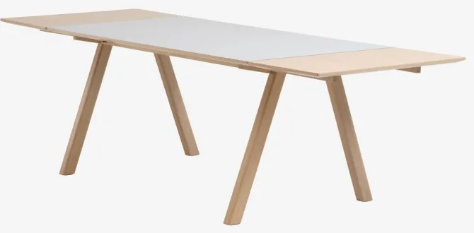 Spisebord inkl. 2 tillægsplader. Lysegrå bordplade i slidstærkt højtrykslaminat. Bordkanten har et egetræslook, som matcher tillægspladerne i egetræsfiner. Ben i massiv eg. Træet er lakeret for at forlænge holdbarheden. Du kan nemt forlænge bordet til enten 205 eller 250 cm for at rumme større sammenkomster. B90 x L160 x H75 cm