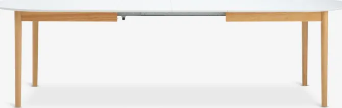 Spisebord med udtræk. Inklusiv 2 tillægsplader, som kan opbevares under bordpladen. Det ovale spisebord har hvid bordplade i MDF og ben i massivt træ. Træet er lakeret for at forlænge holdbarheden. Du kan nemt forlænge bordet til enten 240 eller 280 cm for at rumme større sammenkomster. B100 x L200 x H75 cm