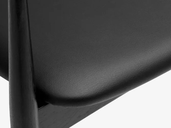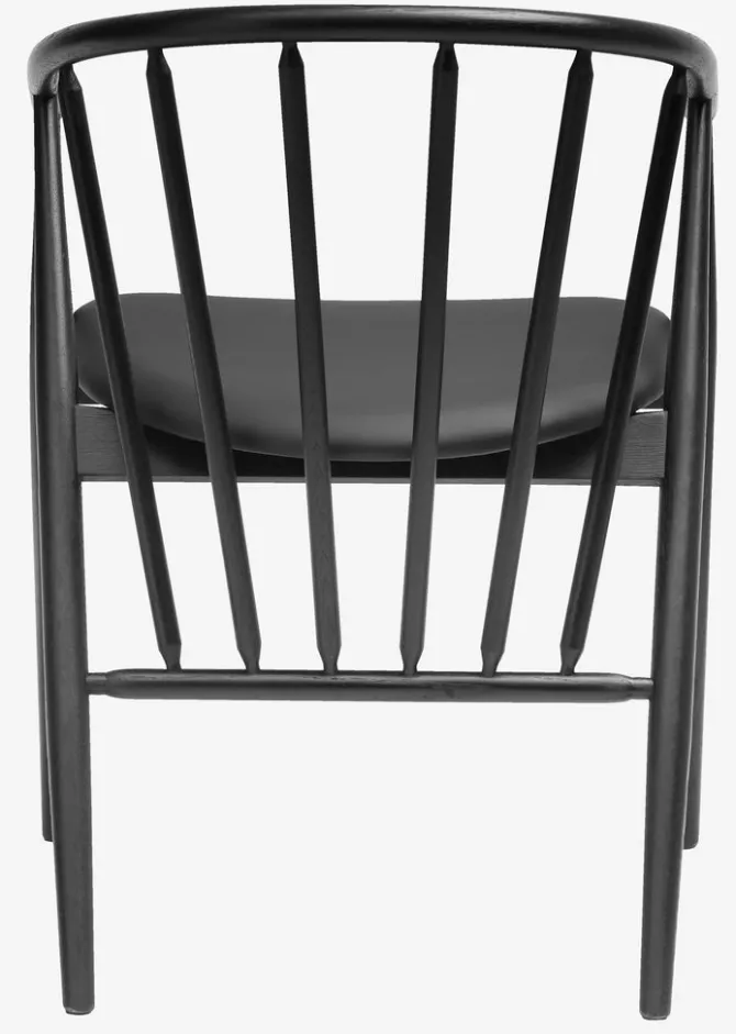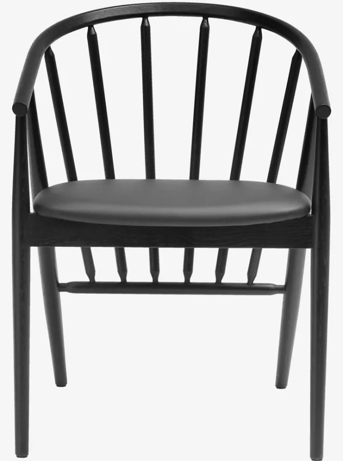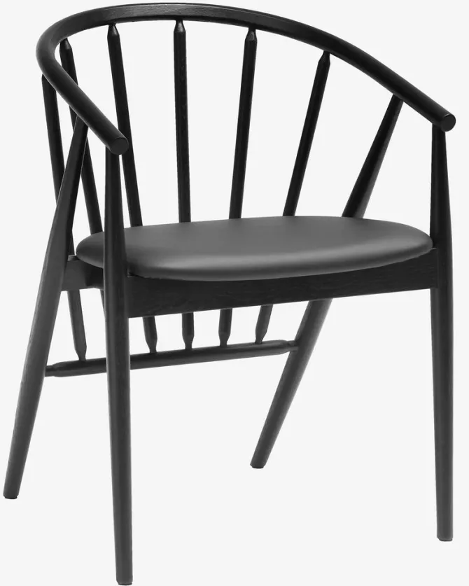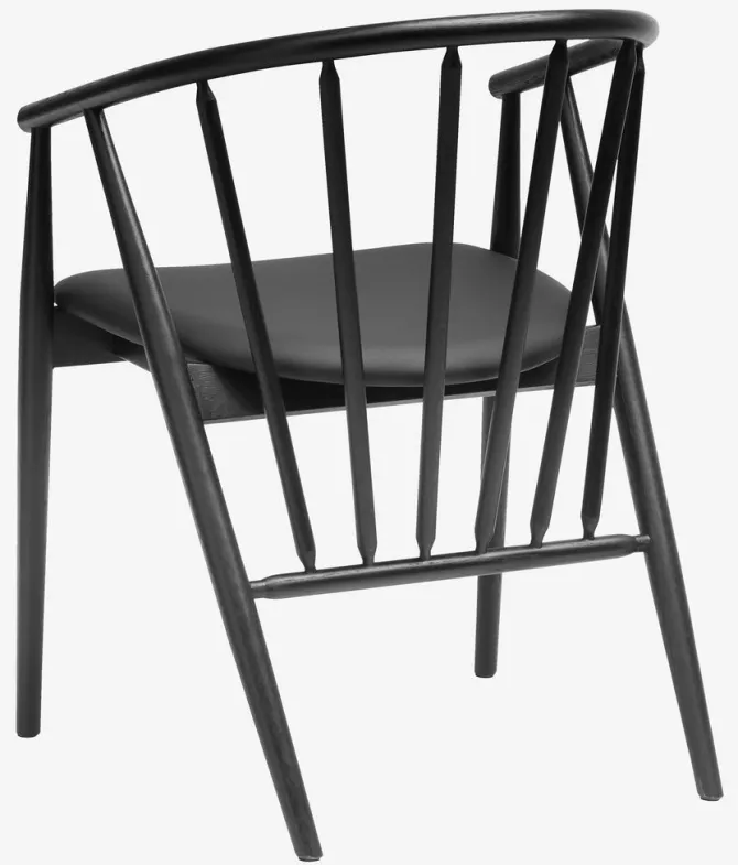 Spisebordsstol med armlæn, der giver ekstra støtte og komfort. Stolen har et polstret sæde i sort kunstlæder. Matchende stel i massiv eg med buet ryglæn.
