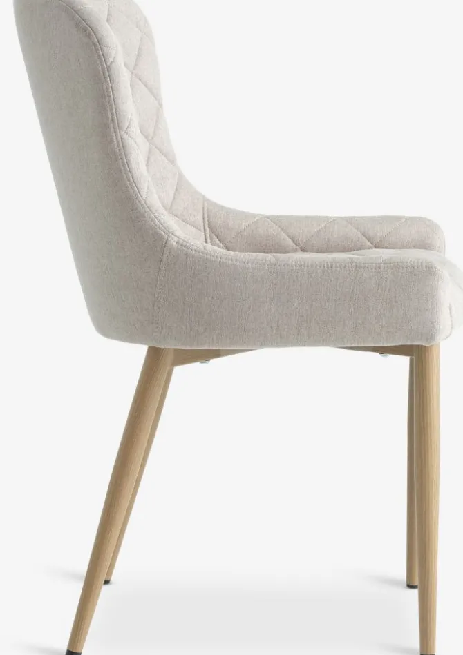 Spisebordsstol med polstret sæde og ryglæn i sandfarvet stof. Ben i stål med egetræslook.